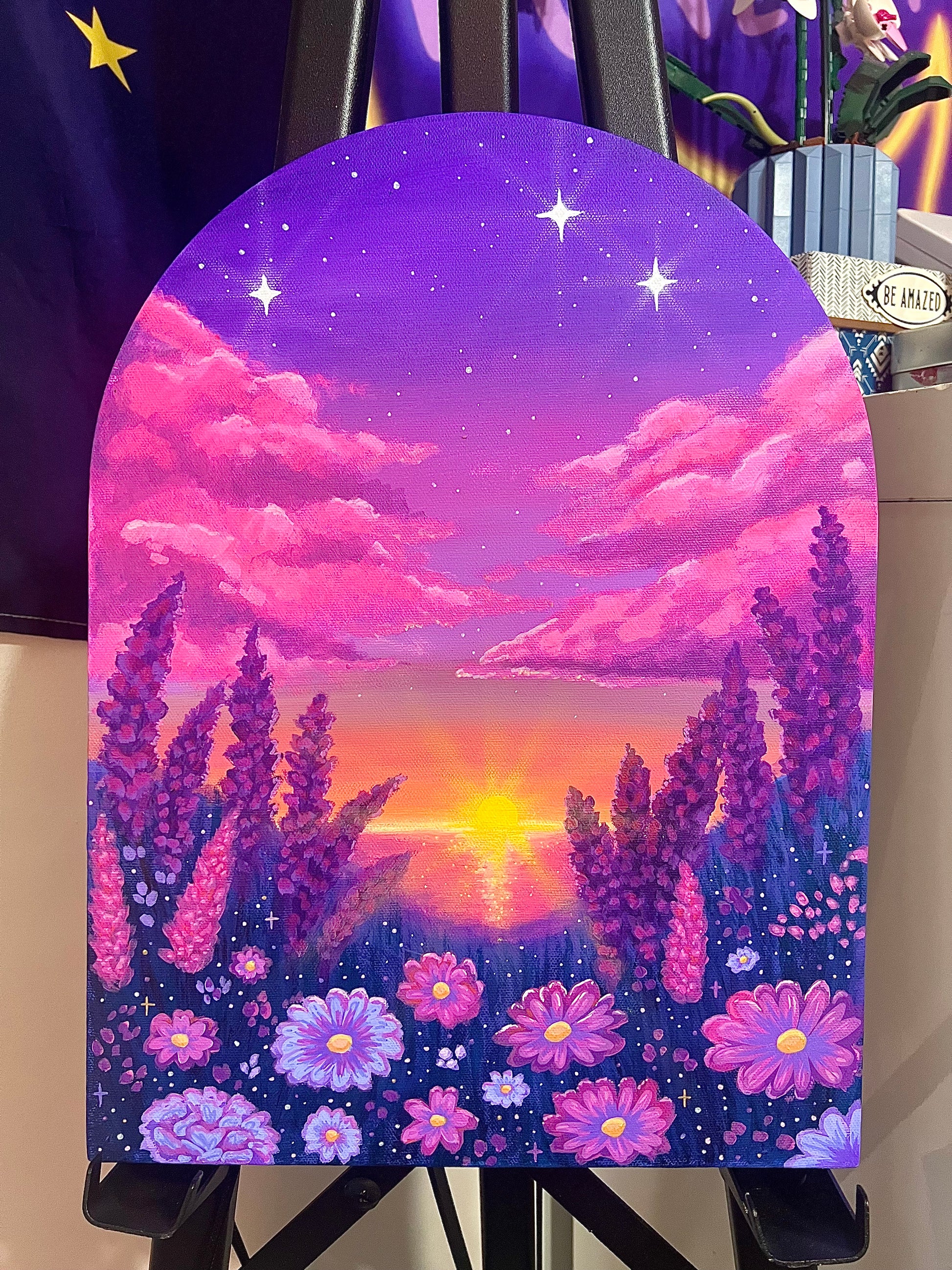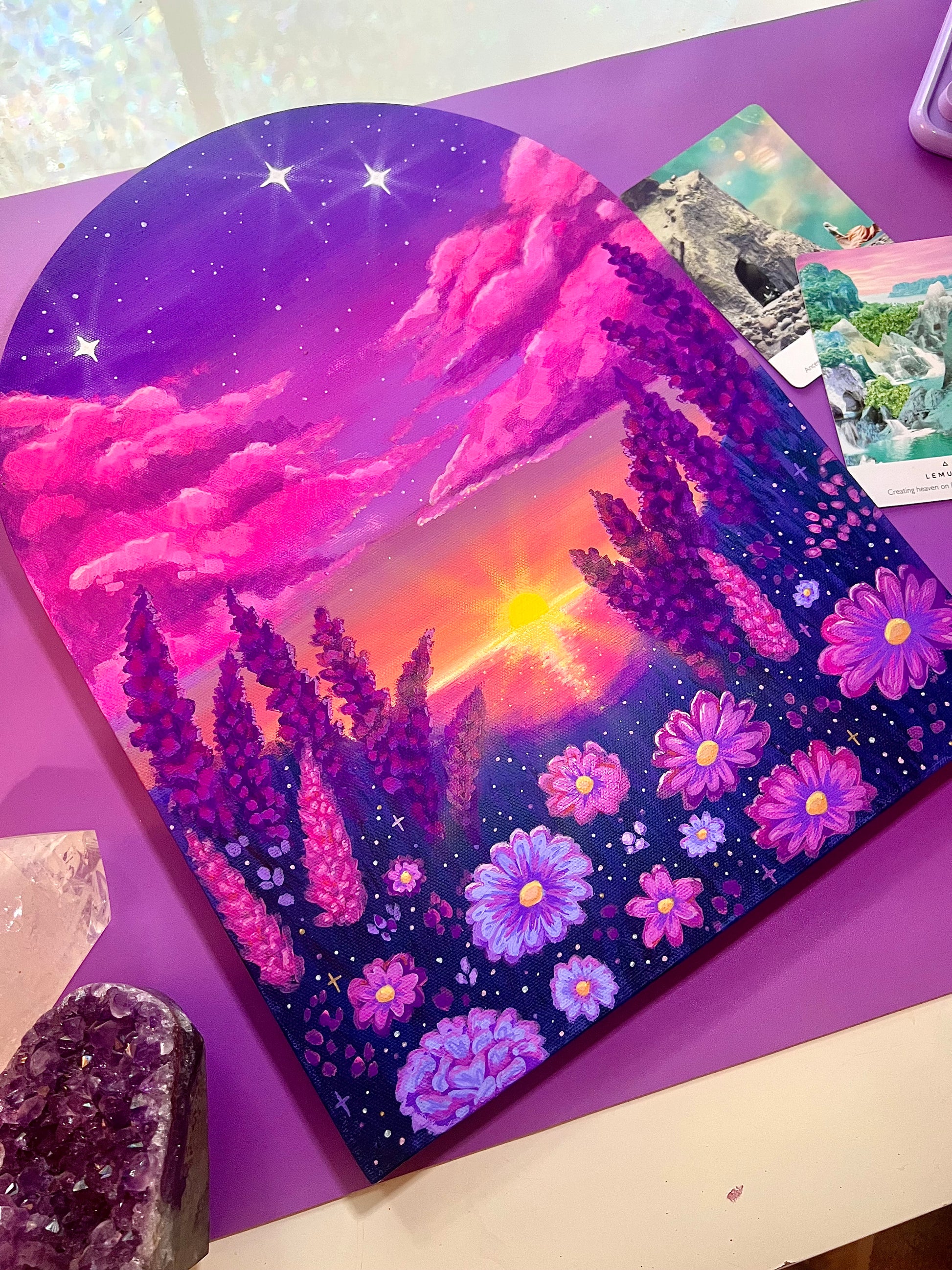 *Keywords:* ocean sunset, lavender fields, acrylic painting, arch-shaped canvas, coastal decor, whimsical art, magical artwork, feminine art, calming art, nature-inspired, unique gift, artwork for bedroom, coastal living room decor, lavender field painting, ocean sunset art, pink and purple decor, starry night sky, whimsical home decor.
