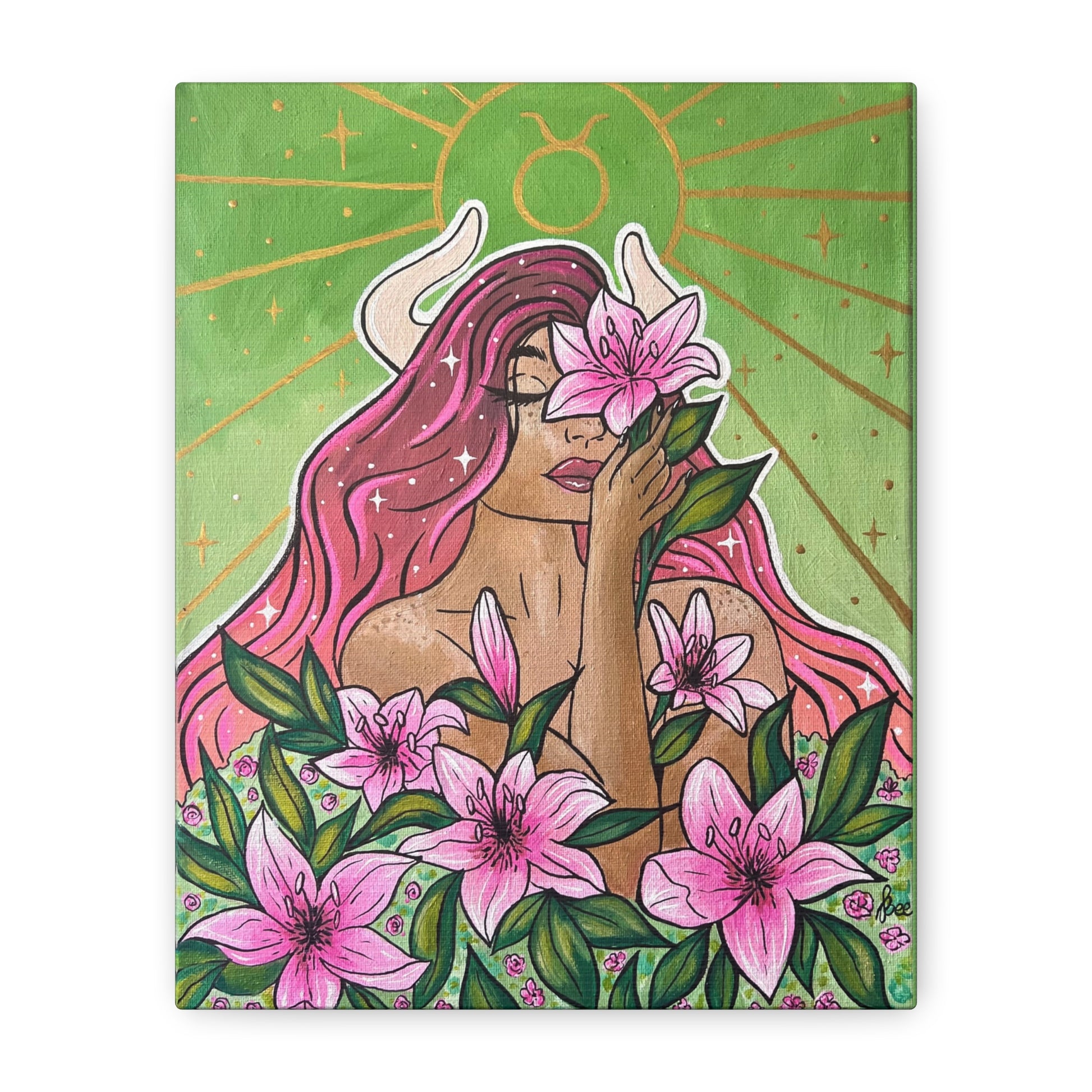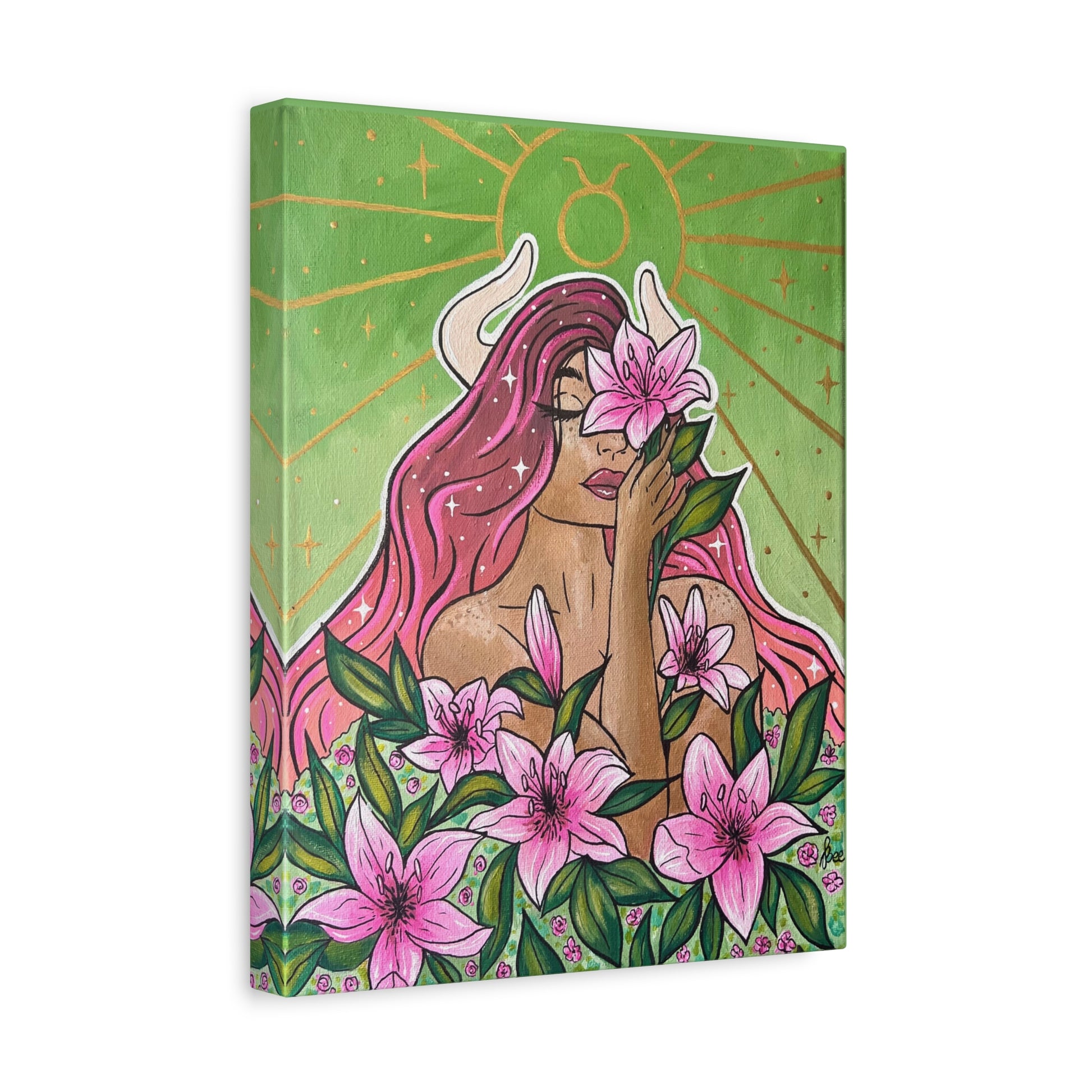 Indulge in the comfort and luxury of this Taurus-inspired canvas print, perfect for those who appreciate abundance, love, and loyalty. This piece exudes a feminine and indulgent vibe, making it a great addition to a Taurus individual's home decor or as a thoughtful gift for birthdays or special occasions.